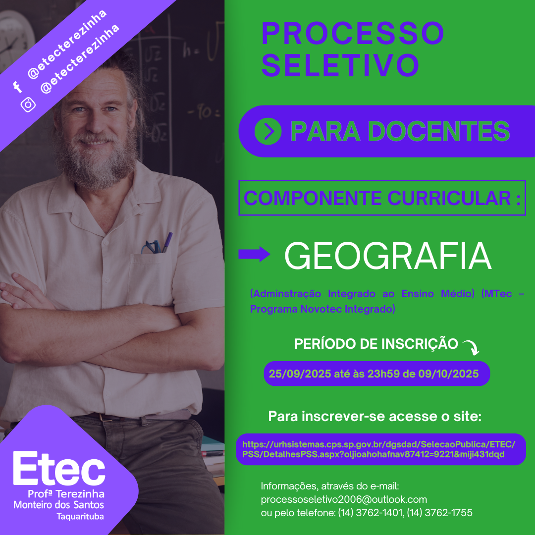 EDITAL DE ABERTURA Nº 140/15/2024 COMPONENTE CURRICULAR: Geografia (BNCC/ ETIM / MTec / EM com Ênfases) (Administração Integrado ao Ensino Médio (MTec – Programa Novotec Integrado) – MTec–PI) ACESSE O EDITAL CLICANDO AQUI