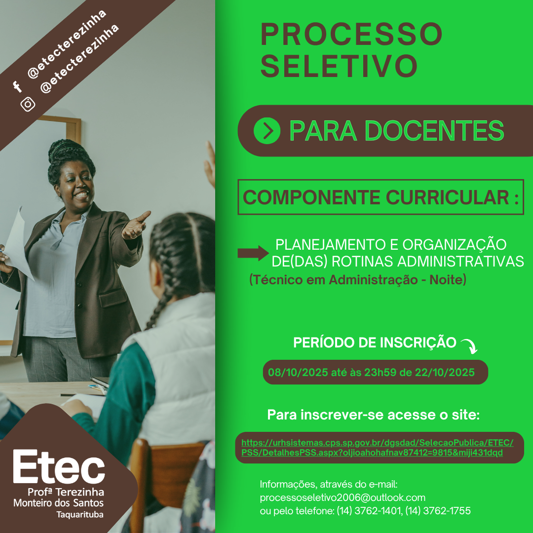 EDITAL DE ABERTURA Nº 140/02/2024 COMPONENTE CURRICULAR: Comportamento Organizacional (Recursos Humanos Integrado ao Ensino Médio (MTec – Programa Novotec Integrado) ACESSE O EDITAL CLICANDO AQUI
